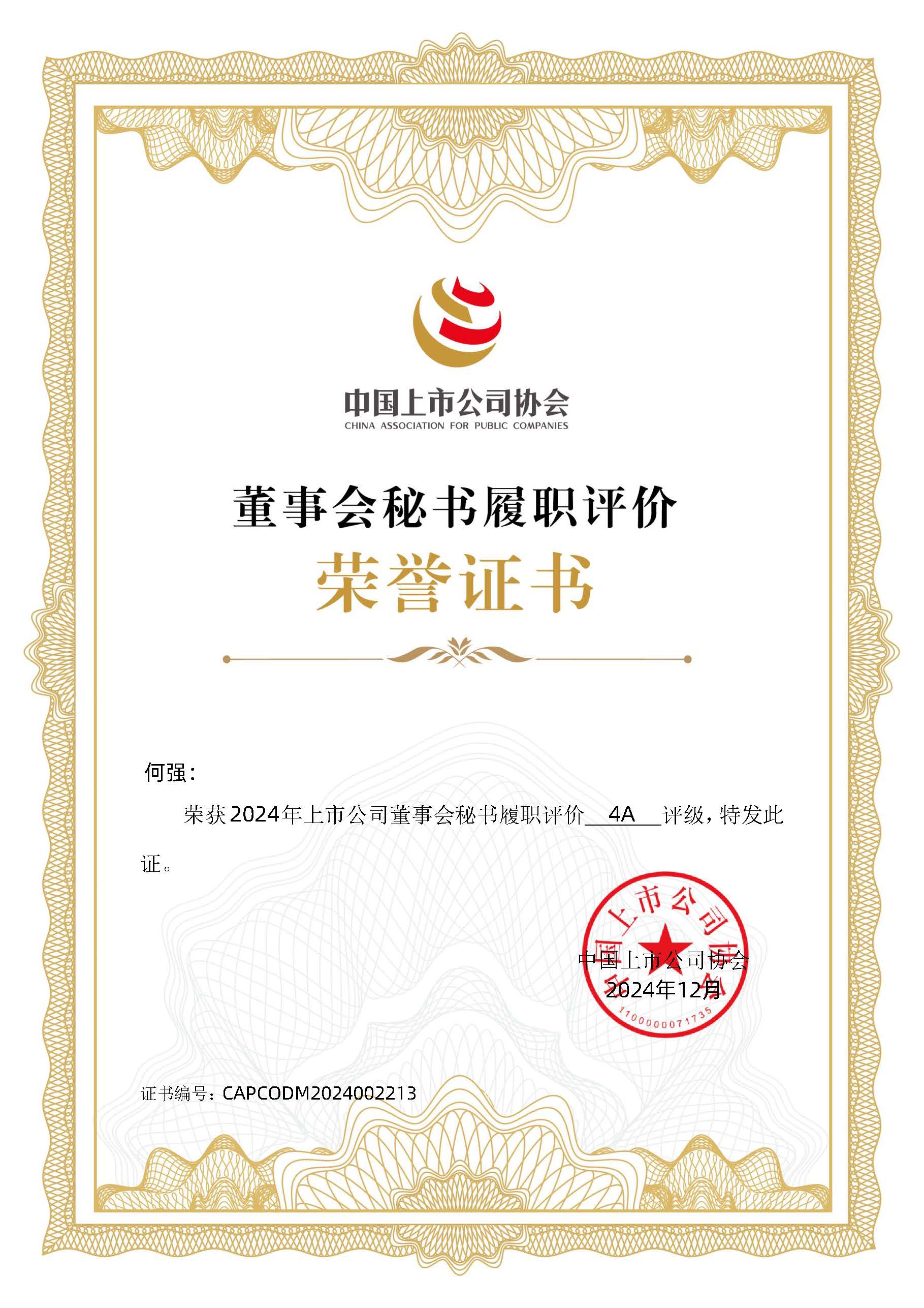 “2024上市公司董事会秘书履职评价”证书