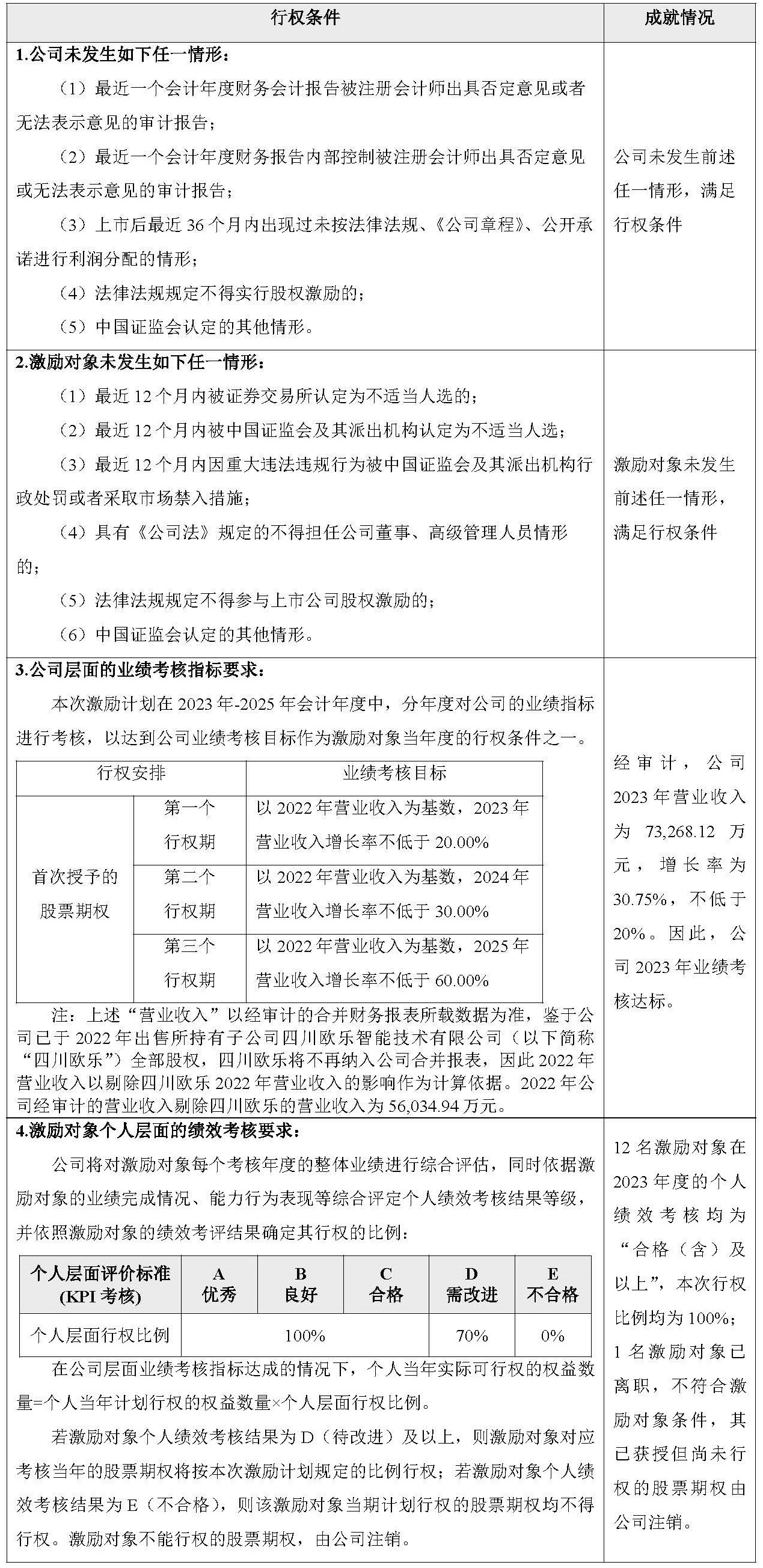 2.2023年股票期权与限制性股票激励计划(以下简称“本次激励计划”)首次授予股票期权第一个行权期符合行权条件的激励对象共12名,可行权的股票期权数量共计16.6380万份,行权价格为12.43元/份。