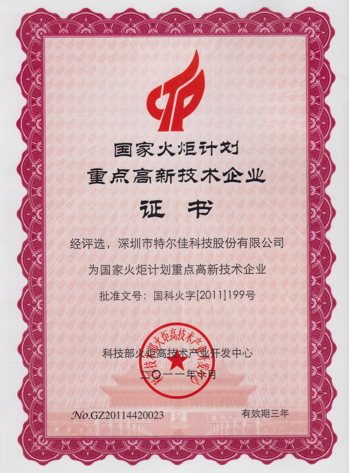 被科技部认定为“国家火炬计划重点高新技术企业”
